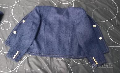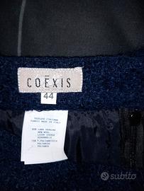 Colore Blu navy . Marca Coexis, taglia 44. In pura lana , non elasticizzato, usato ma ben tenuto, Made in Italy, spalline imbottite, gonna con cerniera dietro. I bottoni e le tasche sono solo di bellezza. Misure giacca : lunghezza spalla-fondo 52 cm, larghezza sotto ascelle 47 cm, lunghezza manica dalla cucitura 50 cm. Gonna lunghezza totale 56 cm ,larghezza vita 34 cm