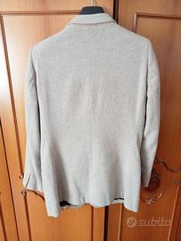 blazer da uomo colore beige chiaro in cashmere e lana. chiusura a due bottoni e tasche a filetto con pattina. taglia M, larghezza spalle 40 cm, manica 61, lunghezza 72. sartoria italiana, marchio Riccardo Piacenza. in ottime condizioni.