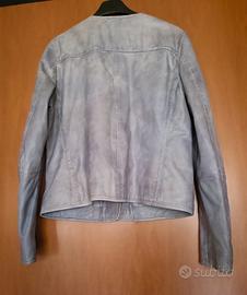 Taglio a girocollo, chiusura frontale con bottoni rivestiti nella stessa pelle, cuciture a vista lungo i profili e quattro tasche applicate sul davanti.