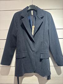 Blazer gessato blu navy con sottili righe bianche verticali. La cintura in tessuto coordinato può essere rimosso per un taglio più dritto e moderno, ideale da abbinare sia a un pantalone classico che a un paio di jeans.