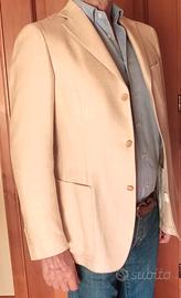 Superbo, pregiato, elegantissimo blazer con finiture sartoriali (tipicamente quelle di Morris), made in Italy, herringbone (spina di pesce), colore beige chiaro, taglia 48 drop 7 R (cfr. dettaglio misure), sfoderato, tre bottoni, tasche esterne e taschino a toppa, ben 4 tasche interne, un solo spacco centrale dietro (scuola Armani).