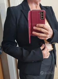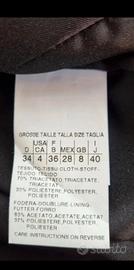 Colore nero. Taglia 40 italiana, veste comodo, direi sino alla 42 italiana. Rifinito, tasche a filetto , ancora da scucire, come i revers, anche loro ancora da scucire. Completamente foderata, acquistata, riposta con cura, e MAI indossata.