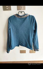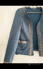 Blazer casual in cotone color blu navy bordato di paillettes color argento, presenti pochi pallini sul retro della manica facilmente rimovibili con l'apposita macchinetta.