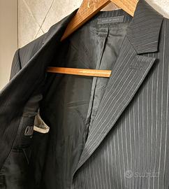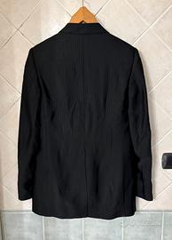 Elegante giacca blazer Carlo Pignatelli, linea Cerimonia. Un capo di altissima sartoria italiana, caratterizzato da un raffinato motivo gessato sottile su base nera. Perfetta per eventi, cerimonie o per un look formale ricercato.