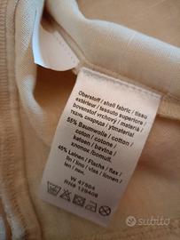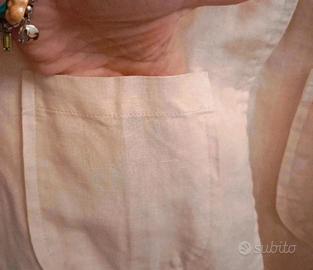 Blazer /giacca molto carino e particolare perché ha il colletto interamente ricoperto di paillettes molto luminose ed eleganti. Maniche a 3/4, ottima qualità e vestibilità. Nuovissimo, puro lino e cotone , bottone vintage . Misura spalle 37 cm veste una s/xs va bene per entrambe