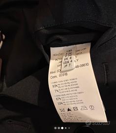Il capo mostrato è un blazer o una giacca corta doppiopetto in tessuto nero, che richiama lo stile di una giacca spencer o un frac.