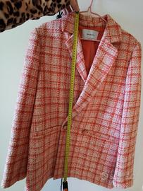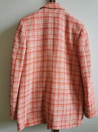 Bellissimo blazer doppiopetto di Stradivarius a quadri stile Tweed corallo/Crema. In perfette condizioni. Taglio lungo, spalle leggermente imbottite. TAGLIA S MA VESTE OVERSIZE praticamente L -spalle 43 cm -lunghezza totale 78 cm (lascio foto col metro) Etichetta è tagliata non conosco la composizione. Vendo perché è largo di spalle e anche lungo (sono 1.52) Se interessate vi mando foto in privato di come veste su di me.