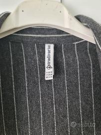 Blazer lungo Stradivarius, colore grigio antracite con righe bianche verticali. Modello con revers classico e maniche arrotolabili con fascetta e bottone.