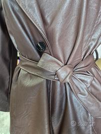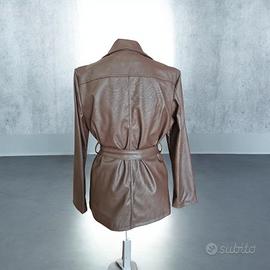 Vendo giacca inecopelle marrone, un capo versatile caratterizzato da un taglio classico a blazer, arricchito da unacintura coordinatada annodare in vita e un bottone per definire la silhouette.