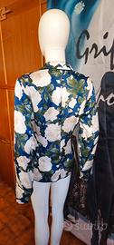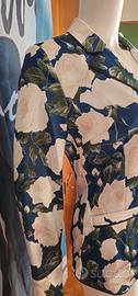 Giacca tg. 40, nuova, tessuto in poliestere ed elastane, tre bottoni frontali, tasche non presenti, griffe Blugirl sul tessuto con stampa a trama di rose bianche. Presenti piccoli riflessi color rosa su manica e colletto. Misure: da spalla a spalla, 41 cm. Da ascella ad ascella, 47 cm. Lunghezza manica, 62 cm. In vita da fianco a fianco, 41 cm. Lunghezza giacca, 63 cm.