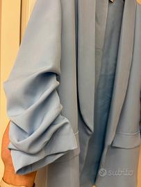 Blazer donna azzurro con maniche arricciate, foderato internamente. Taglia unica.