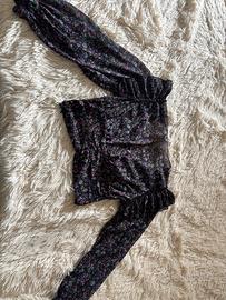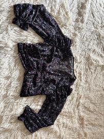 Elegante blusa con stampa floreale su fondo nero. Il tessuto leggero e le rouches sulle maniche la rendono un capo unico. - Maniche con rouches - Stampa floreale multicolore - Tessuto leggero