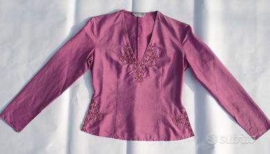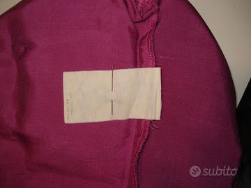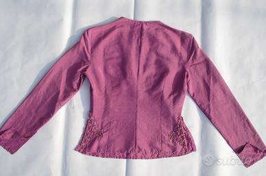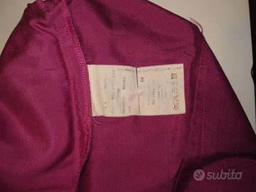 Famiglia privata vende come usato in perfette condizioni (prezzo trattabile), una elegante blusa di seta color viola chiaro brillante, con perline di vetro in tinta applicate a mano. EMPORIO ARMANI originale, Made in India; per ragazza/donna TG. 40 (italiana). Capo rigorosamente vintage, degli Anni '90. Blusa in raffinato tessuto di leggerissima seta ad irregolare lavorazione naturale, apparentemente, un poco “grezza” in cui si notano fibre sottili ed anche lievemente più spesse. Tessuto traslucido che riflette luminosi bagliori, lievemente cangianti se colpito dalla luce diretta del sole; oppure, da quella artificiale. Questa elegantissima blusa, che etnicamente ricalca le affascinanti atmosfere d’Oriente; presenta una importante scollatura a “V”; lunghe maniche a ¾, affusolate e con finale spacco laterale; più altri due ampi spacchi sui fianchi, in fondo (rispettivamente, a sinistra e a destra; dov’ è presente una cerniera media, applicata a lato), su modello infiancato, ben aderente al busto. Ad arricchire il tutto, è la raffinata aggiunta artigianale di perline di vetro multicolore, più o meno, della stessa tonalità violacea del tessuto; al quale, esse aggiungono ulteriore lucentezza, sia per la materia (il vetro trasparente), sia per il loro più svariato colore; presentandosi generosamente applicate in alcuni punti precisi della blusa, cucite ed unite tra loro da un sottilissimo filo metallico che sembrerebbe di rame. Questo elegante capo, firmato dallo stilista Giorgio Armani per il suo illustre Emporio, è in perfetto stato, accuratamente lavato, igienizzato e stirato; si presenta come nuovissimo sia nel tessuto (100% Seta), sia nella sua stessa colorazione (come da foto). Misure Blusa in centimetri: Circonferenza petto (davanti e dietro), cm. 90; Circonferenza vita, cm. 74; Larghezza spalle dietro, cm. 41; Lunghezza manica, cm. 58; Lunghezza totale dell’intera blusa, cm. 56. Capo femminile, veste soltanto una TG. S (small); ossia, un’Italiana TG. 40.