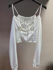 Blusa bianca arricciata e elasticizzata sul retro, con allacciatura sul davanti