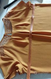 Blusa Camaieu colore senape, in poliestere e pizzo, taglia XL (manca etichetta, misure in foto) molto elegante con pieghine sul davanti che le danno una vestibilità morbida. Pizzo sulle spalle e dietro.