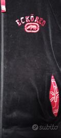 Giubbino ciniglia nero con cappuccio cerniera sul davanti e fodera rossa tg S