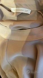Blusa a maniche lunghe color cipria firmata Tensione In, taglia S. Composizione: 100% poliestere. Collo alto stondato, chiusura a goccia sul retro e maniche con laccetti che permettono di realizzare piccoli fiocchi. Vestibilità morbida.
