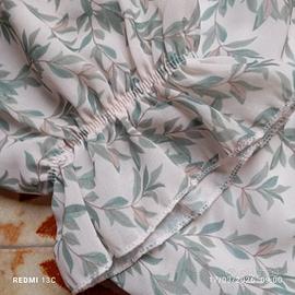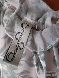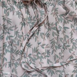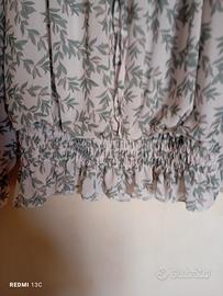 Blusa con stampa floreale e maniche lunghe. - Scollo a barca con laccetti. - Elastico in vita e ai polsi. - Tessuto leggero e trasparente. Delicata fantasia con rametti verde oliva e dettagli di foglie beige su sfondo panna. Scollo a barca con elastico e sottili laccetti che scendono delicati. Elastico che crea un effetto leggermente rigonfio valorizzando la vita.Polsini elasticizzati che lasciano intravedere una graziosa parte di tessuto. Interno foderato tipo cotone, mentre le maniche restano leggere e fresche. Ideale per primavera o serate estive. taglia unica ma veste piccola. indossata una volta.