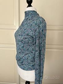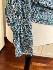 Deliziosa blusa con fantasia di micro fiori nei toni dell’azzurro, accollata davanti e con scollo ad oblò sul dietro. Maniche che terminano con una balza. Mai utilizzata.