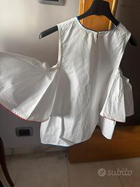 Blusa in cotone bianco con maniche effetto cut-out, parzialmente staccate con bordino blu sul collo in fondo e bordino rosso sulla manichina ad aletta