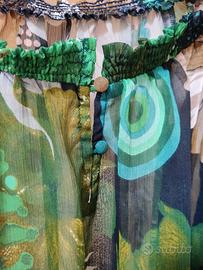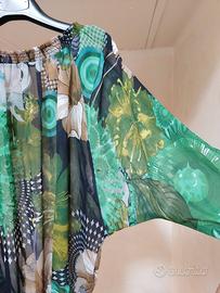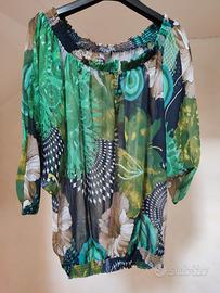 Blusa donna Desigual con ampia scollatura davanti e dietro con maniche 3/4 a pipistrello e chiusura con due bottoncini sul retro. Etichetta Desigual tagliata e non visibile perché fastidiosa. Ampia vestibilità. Misura da spalla a spalla cm 42 circa, lunghezza cm 51.