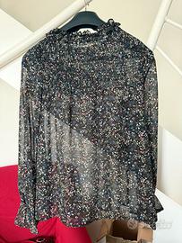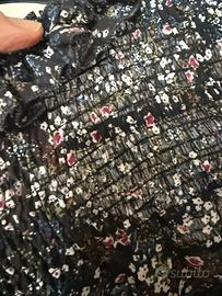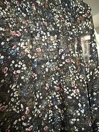Blusa da donna con fantasia floreale su base nera. Tessuto molto leggero e leggermente trasparente, ideale da indossare con top sotto.