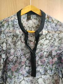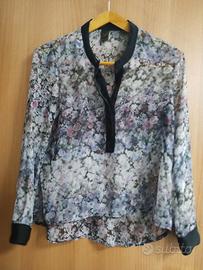 leggera blusa trasparente di colore viola - nero con fantasie floreali multicolori. colletto e polsini neri. con due bottoni a scomparsa frontali più uno sui polsi. taglia indicata P brasiliana che corrisponde ad una S internazionale. spalle 38 centimetri, lunghezza 55 cm. al 100% in poliestere. marca Zimpy. fresca e lucente la blusa è pari al nuovo. senza difetti viene spedita lavata e stirata.
