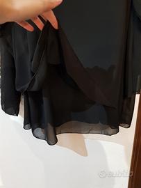 Blusa donna di colore nero in 50% viscosa e 50% poliestere. Possibilità di portare le maniche sia lunghe che un po' arricciate grazie ad un bottoncino color argento presente sulla manica.