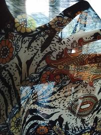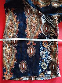 Vendo casacca da donna a manica corta con motivi a fantasia, la taglia è una L come da etichetta, ho anche inserito delle foto con alcune misure per aiutare. Indossata molto poco. Lunghezza posteriore 85cm Lunghezza anteriore 70cm Lunghezza spalle 40cm Lunghezza ascellare 50cm Lunghezza manica 33cm Larghezza manica 20cm Tessuto leggero e trasparente, molto fresco in estate. Viscosa 100%.