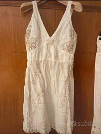 Bellissimo completo in puro lino con blusa (che può essere indossata anche come abito) e pantaloni cropped. Colore écru. Taglia 42/44. Intarsi ricamati lo valorizzano.
