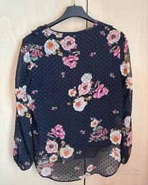 Indossata pochissime volte, infatti è come nuova. Molto leggera ed elegante, da signora. Si presenta blu scuro con fantasia floreale molto delicata, nei toni del rosa. formata da due strati: uno in poliestere, l'altro in tessuto sottile trasparente a pois. Presenta delle rouges davanti.