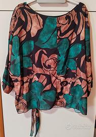 Blusa elegante da donna, con maniche a 3/4, fantasia floreale astratta sui toni del verde, marrone e nero. Ampiezza spalle 39 cm, lunghezza 60 cm. Fiocco decorativo in basso a sinistra. Canotta nera interna elasticizzata.
