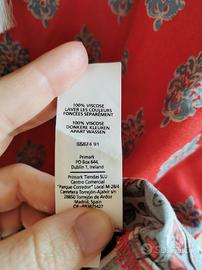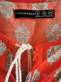 Leggera e fresca blusa estiva Atmosphere, in 100% viscosa. Taglia 40, misure in foto. È nuova, non ricordo di averla mai messa. Presenfa una stampa etnica a medaglioni, color corallo con dettagli in blu avio, bianco e rosso. Taglio fluido e scivolato. Scollo tondo con laccetti bianchi e nappine regolabili. Maniche corte leggermente arricciate sulla spalla, rifinite con un bordo in crochet bianco.