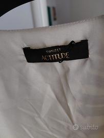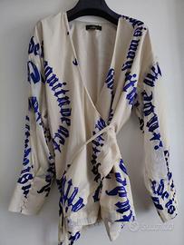 Blusa a portafoglio TWINSET Actitude - Fantasia Lettering Descrizione: Vendo bellissima blusa firmata Twinset (linea Actitude), caratterizzata da un design moderno e ricercato. Il capo è un modello a portafoglio (wrap top) con scollo a V e chiusura tramite laccetti laterali che permettono di regolare la vestibilità in vita. Dettagli di stile: Fantasia all-over con scritte stile "calligrafia" in blu elettrico su fondo bianco/panna. Maniche: Lunghe, rifinite con eleganti polsini alti chiusi da una fila di bottoncini rivestiti (stile retrò). Tessuto: Leggero e fluido, ideale per la primavera o per una serata elegante. Condizioni: Ottime, indossata pochissimo e tenuta con cura. Taglia: [ S o 42] Perfetta da abbinare a un paio di jeans per un look casual-chic o a un pantalone a sigaretta per un contesto più formale.