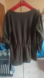 Blusa con grande scollo, per eventualmente lasciare una spalla scoperta.,, Le maniche si possono ripiegare e fermare con i bottoni e orlo inferiore in diagonale.