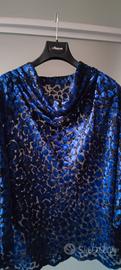 Capo con rifiniture di prestigio, collo a goccia con pesetto per mantenere sempre la forma. Il tessuto è composto da velluto blu cobalto e cotone trasparente nero. Maniche terminanti con 2 bottoncini e strass. Taglia 44/46. La blusa scende morbida e con ottima vestibilità..Disponibile per chiarimenti.