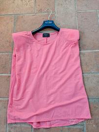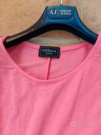 Morbida blusa colore salmone di Motivi Jeans. Ha spalle importanti perché sono applicate spalline. Leggermente stondata sul fondo Viscosa Taglia M. Quasi inutilizzata ma manca una etichetta interna perché fastidiosa. Lunga cm 62, distanza tra ascelle cm 57