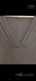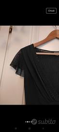 Scollo a v impreziosito da punti luce. Maniche velate. doppia stoffa sul corpino. Nylon. Mai indossata.