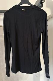 Blusa nera con anelli metallici sulle maniche originale Guess, perfetta per ogni occasione. Il tessuto a costine dona un tocco di stile unico e vestibilità aderente.