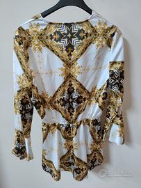 Vendo bellissima blusa/top a portafoglio, realizzata con una splendida stampa ornamentale nei colori nero, oro e bianco. Il capo è prodotto in Italia (Prato) e presenta una qualità del tessuto superiore rispetto alle grandi catene.