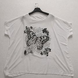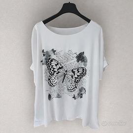 Blusa oversize taglia 58, elegante e fluente. Doppio strato: canotta in viscosa sotto e tessuto velato sopra. Grafica farfalla artistica e dettagli floreali raffinati. Linea morbida e ampia, perfetta per valorizzare le forme curvy. Misure: seno (ascella/ascella) 60 cm canotta sotto, tessuto sopra 84 cm. Vestibilità comoda e leggera, ideale anche per cerimonie o eventi speciali. Come nuova, senza difetti. Stile sofisticato e femminile, facile da abbinare a pantaloni eleganti o jeans. Un capo che unisce comfort e classe.