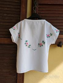 Blusa camicetta maglietta in cotone Handmade da riciclo di tovaglia vintage ricamata con applicazioni floreali in rosa e verde su fondo bianco Consiglio a partire da M, in foto su un manichino taglia italiana 44/46 ma veste anche di più Larghezza ascella-ascella 58cm, tenete presente che è un tessuto fermo, non estensibile, lunghezza dalla spalla 57cm