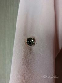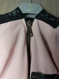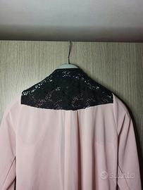 Il colore rosa cipria dona luce e delicatezza, mentre gli inserti in pizzo nero sulle spalle aggiungono carattere e un tocco chic.
