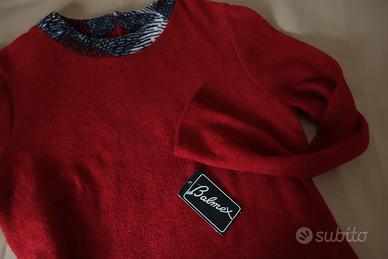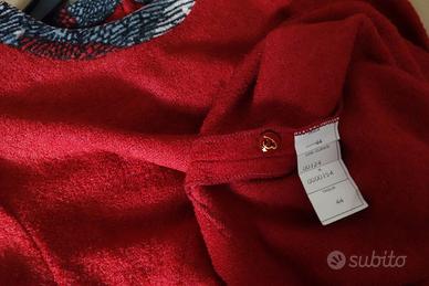 Blusa colore rosso scuro rubino; modello giro collo profilato con bordo nello stesso tessuto ma fantasia.