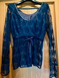 Vendo elegante blusa in pizzo blu sartoriale ben cucita,rifinita con bordi in raso,foderata,sottile cinta in raso,maniche lunghe,taglia 44.Ottimo stato.No spedizione