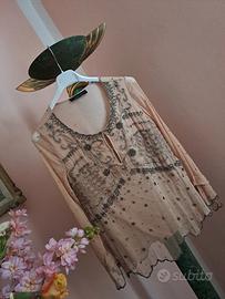 stupenda blusa in crepe di seta color carne..trasparente..foderata all'interno in morbida maglina..TG.S...ricami e corallini..in ottime condizioni..presenta una leggera macchiolina di profumo nella parte della schiena