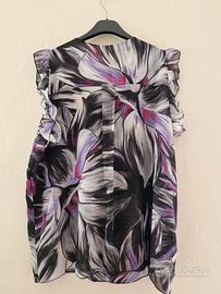 Vendo blusa smanicata da donna, perfetta per la stagione primavera/estate. È un capo Made in Italy. TAGLIA UNICA Stile: Elegante e femminile, caratterizzata da romantici volant (rouches) sulle spalle che donano movimento. Design: Sul davanti presenta una raffinata plissettatura centrale che crea un effetto drappeggiato molto chic. Fantasia: Vivace stampa floreale stilizzata nei toni del nero, bianco, viola e fucsia, molto facile da abbinare. Ottime condizioni e tenuta con molta cura. Non presenta difetti. #BlusaFloreale #MadeInItaly #MagliaSmanicata #Volant #Elegante #PrimaveraEstate #Plissettata #FioriViola