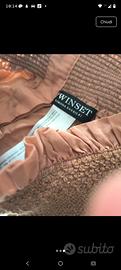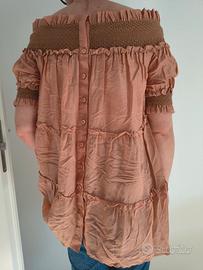 Bellissima blusa firmata Twinset Milano, originale e dal design romantico e ricercato. Il capo è caratterizzato da uno scollo a barca (stile Bardot) con una fascia elastica in maglia lavorata color nocciola che permette di portarla con le spalle scoperte. Dettagli principali: Stile: Modello a balze (tiered) con piccoli volant che donano movimento e volume. Maniche: Corte, con dettaglio elastico in maglia richiamato dallo scollo. Retro: Chiusura integrale con bottoncini foderati in tinta (molto elegante). Colore: Rosa salmone / Pesca polveroso. Tessuto: Leggero, fresco e leggermente satinato, perfetto per la primavera/estate. Condizioni: Ottime condizioni, indossata pochissimo e ben conservata. Ideale da abbinare a un paio di jeans per un look boho-chic o a un pantalone bianco per un’occasione più formale.