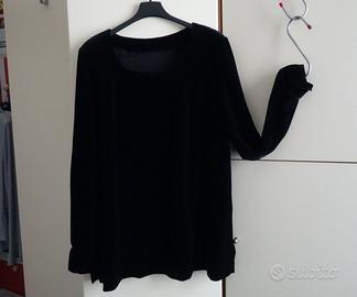 Bellissima blusa in velluto nero, elegante. Modello svasato, con spacchi ai fianchi; con pinces nel punto del seno, scollo a cuore, manica lunga con polsino.