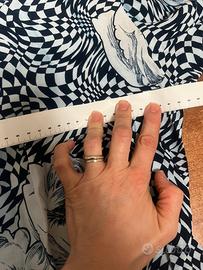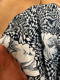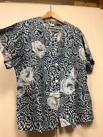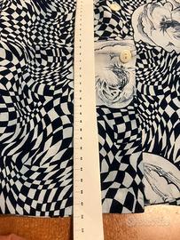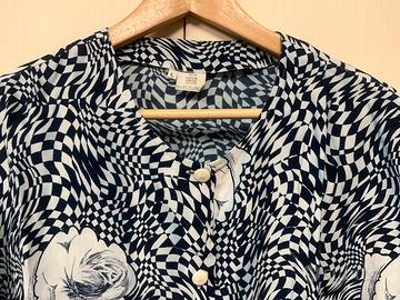 Blusa Vintage in ottime condizioni, fantasia geometrica con rose, materiale 100% viscosa, essendo Vintage riporto anche le misure: da ascella a ascella 62 cm, lunghezza 68 cm. Possibilità di consegna a mano zona centro Milano oppure sera o weekend in piazzale Martini zona sud di Milano.